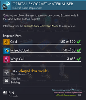 It can only be built o See more. Orbital Exocraft Materialiser Gold x150 Ionised Cobalt x50 Warp Cell x3 Additional information The blueprint can be acquired from the Construction Research Station for 1 Salvaged Data. How to make them what they.